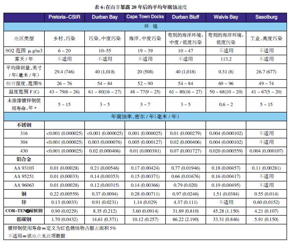 表3至表6的數據來自于日本、巴拿馬、Kure 海灘(北卡萊羅納州)和南非的試驗地點。可利用這些數據在類似環(huán)境中選擇適當的金屬材料,進行生命周期成本分析。